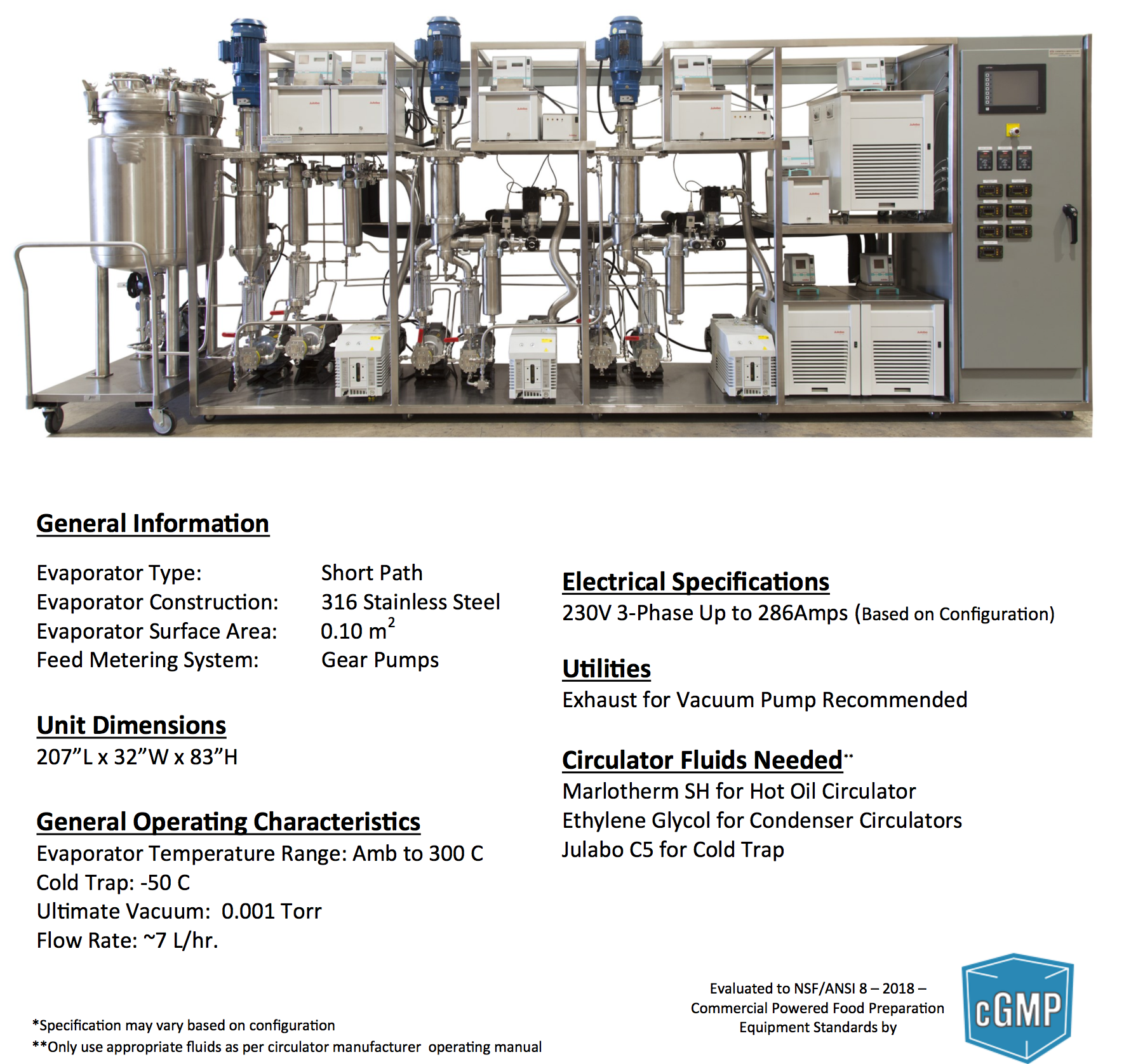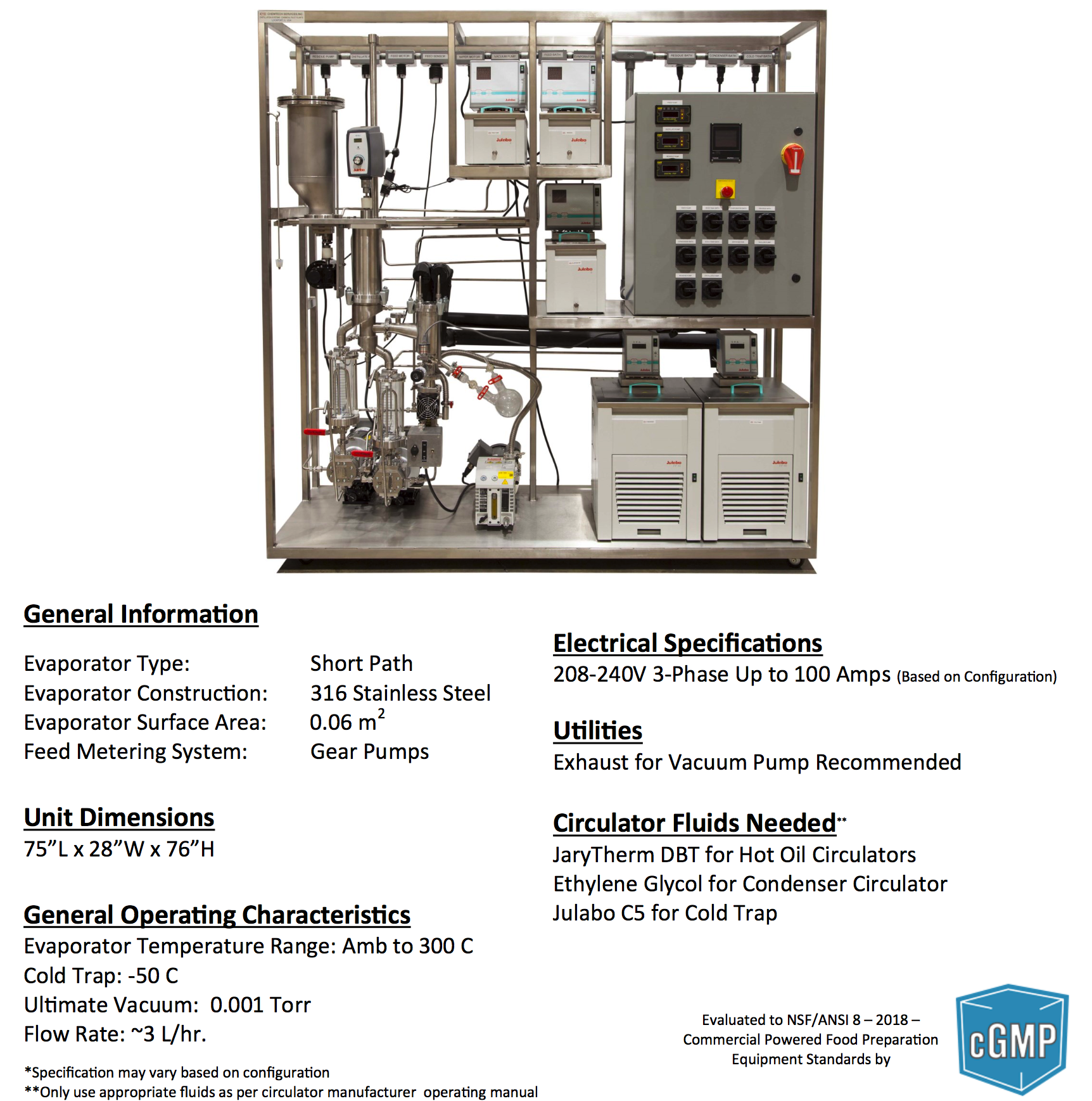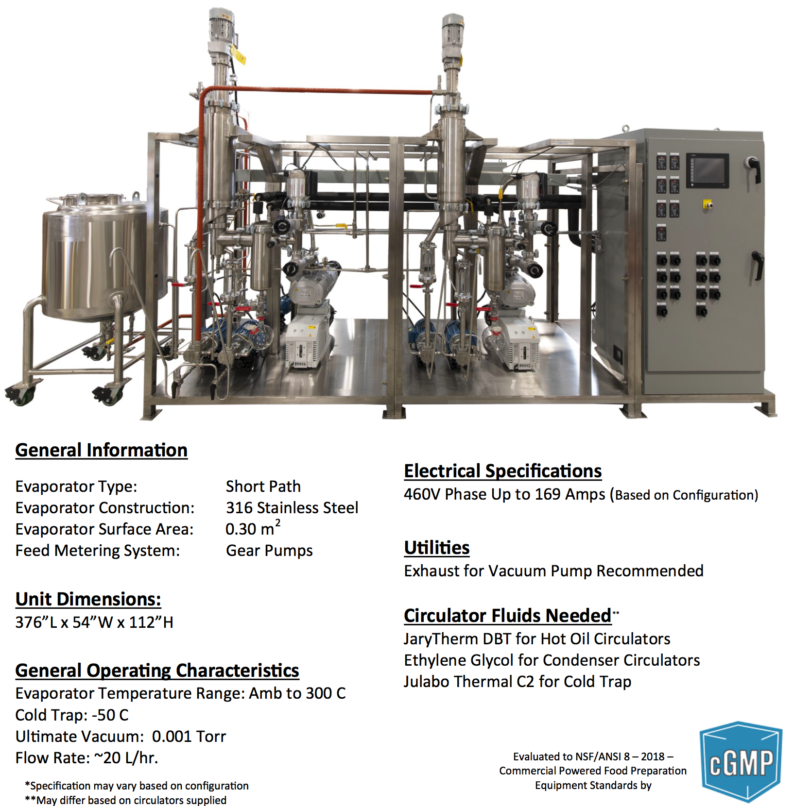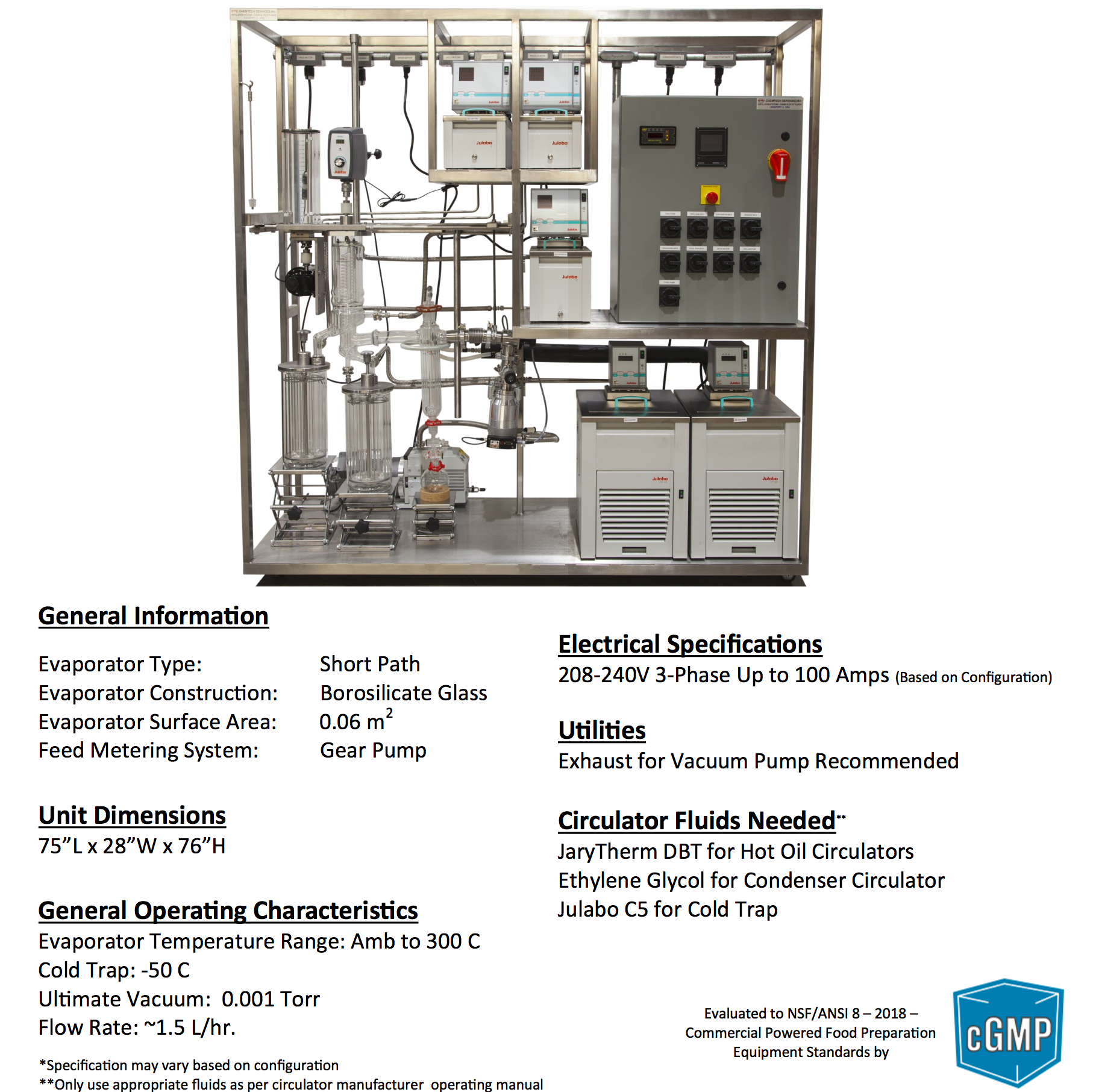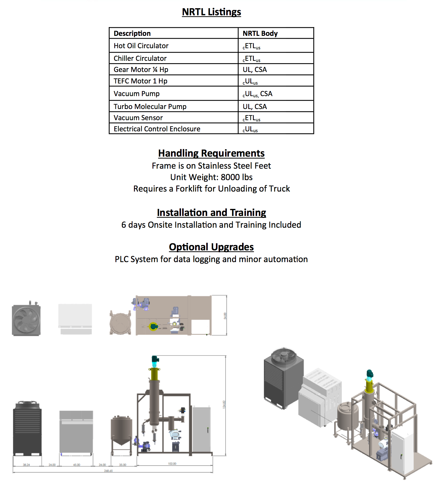 Processing rates are based on the system’s capacity to feed crude into the evaporator: average runtimes, yields, and final potency are dependent on input material, generally base on extracted biomass material anatomy, quality, and processing protocol.Check with your local Fire Marshall, Federal, and Industry Regulators for additional information.Shipping dimensions and weights may vary.All specification subject to change.Stock photo may not represent actual system as sold to date.Product performance, specification, and packages subject to change.Customized systems may have longer lead times. Equipment manufactured to be used only for legal purposes. Ask us about discounted Used and Refurbished systems sold “as is”.