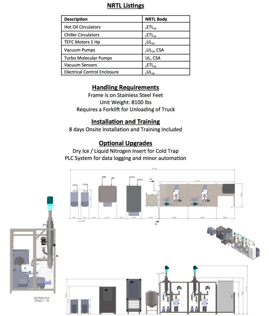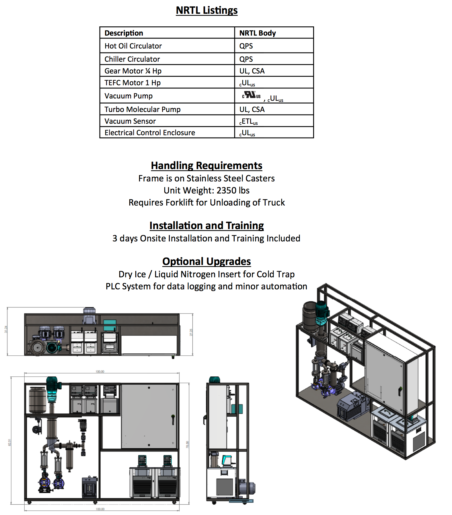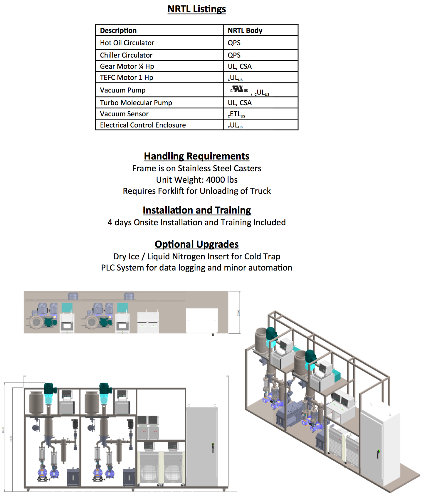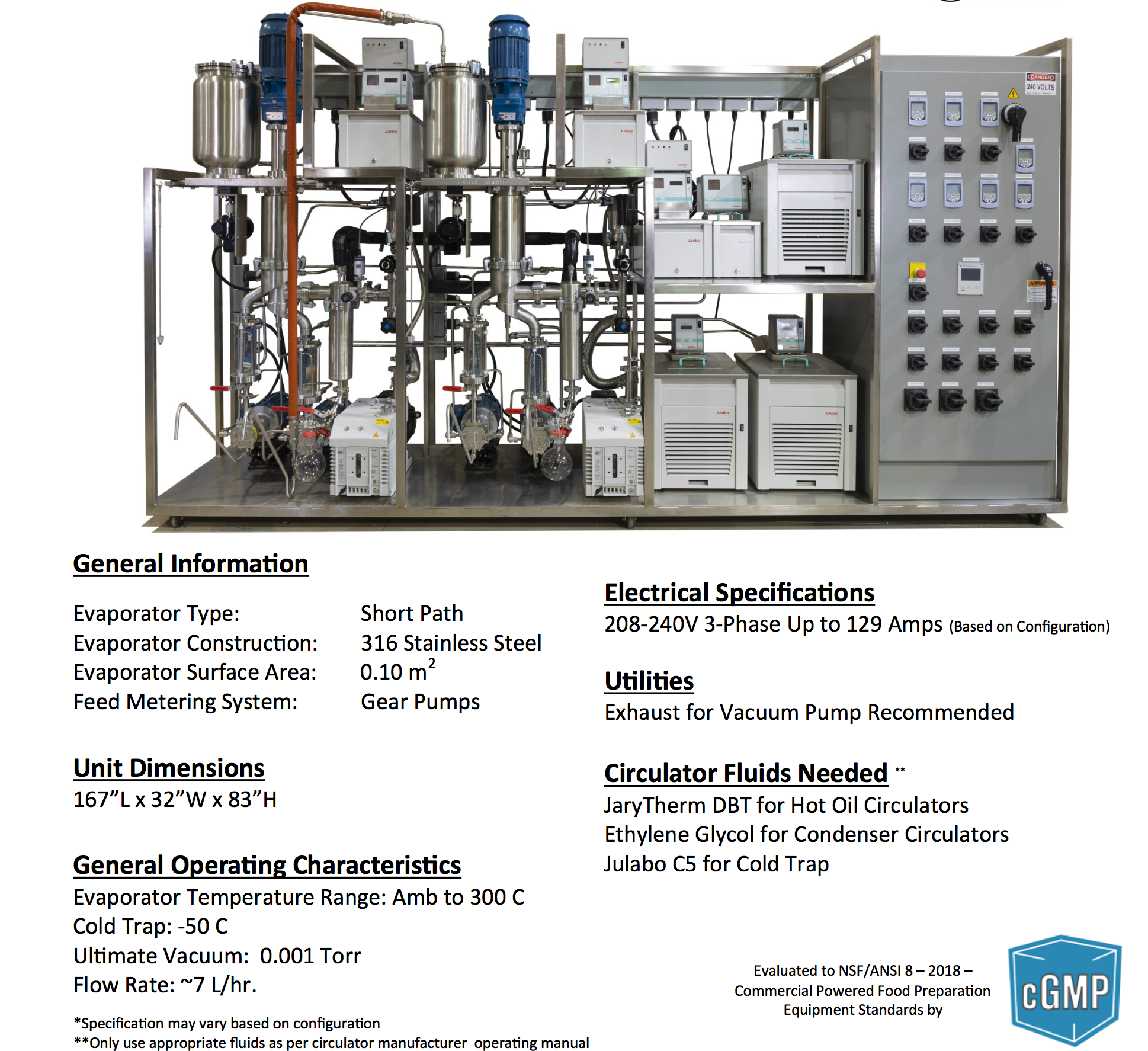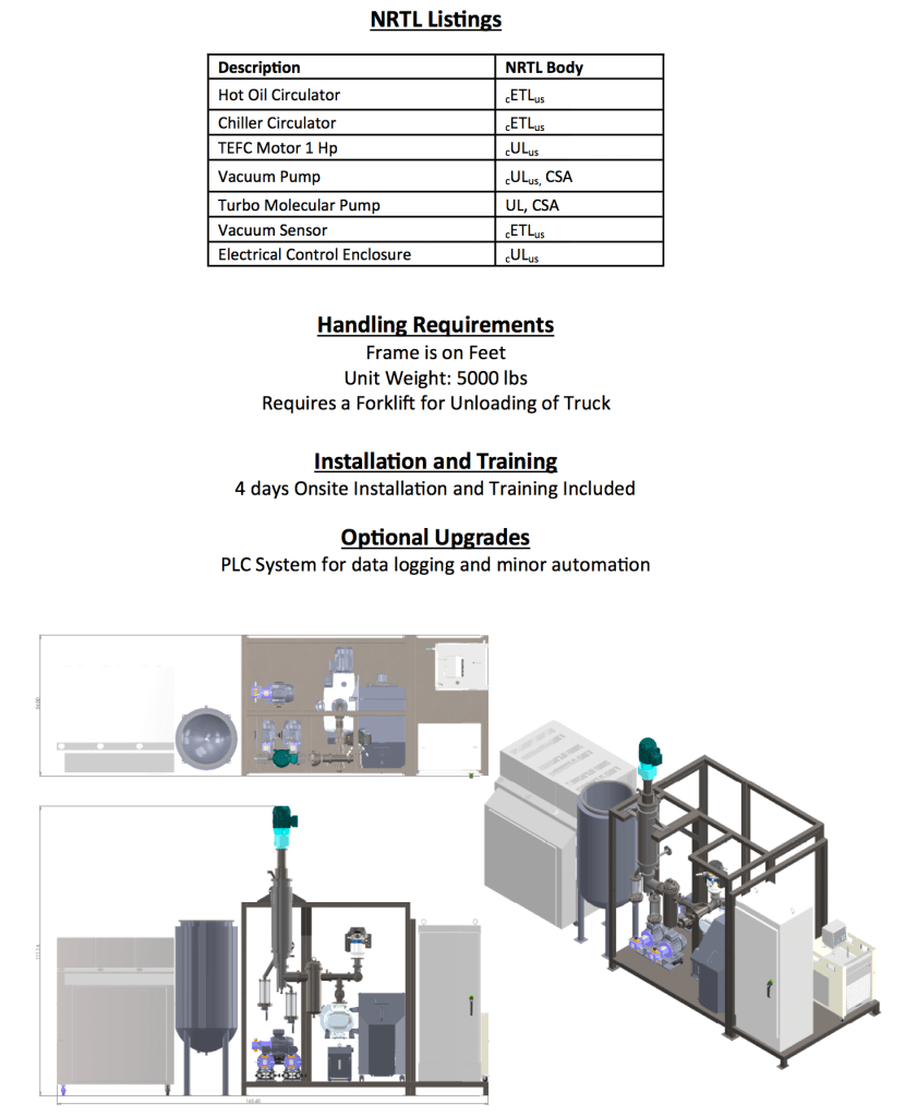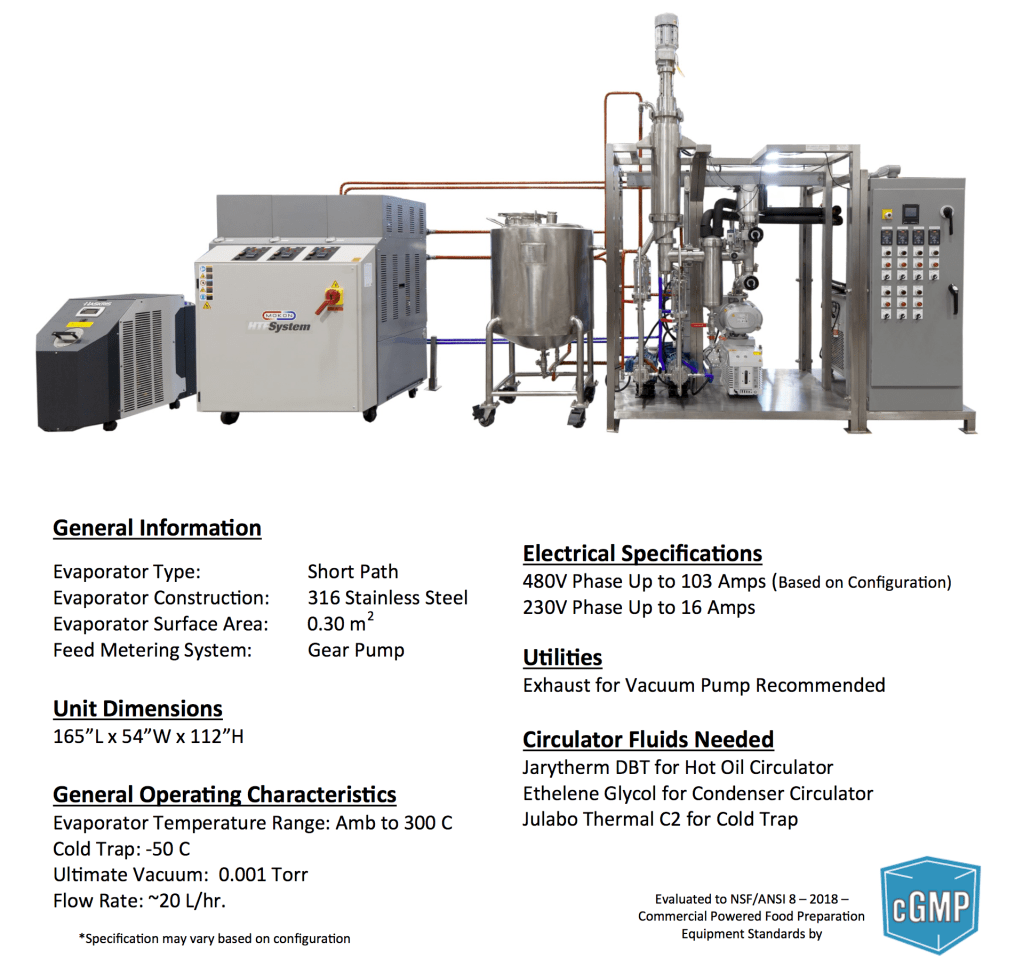 Processing rates are based on the system’s capacity to feed crude into the evaporator: average runtimes, yields, and final potency are dependent on input material, generally base on extracted biomass material anatomy, quality, and processing protocol.Check with your local Fire Marshall, Federal, and Industry Regulators for additional information.Shipping dimensions and weights may vary.All specification subject to change.Stock photo may not represent actual system as sold to date.Product performance, specification, and packages subject to change.Customized systems may have longer lead times. Equipment manufactured to be used only for legal purposes. Ask us about discounted Used and Refurbished systems sold “as is”.