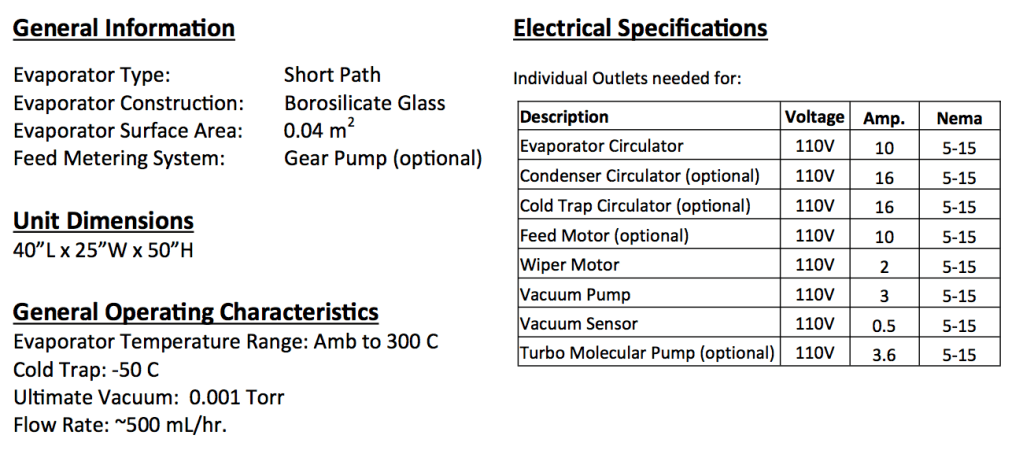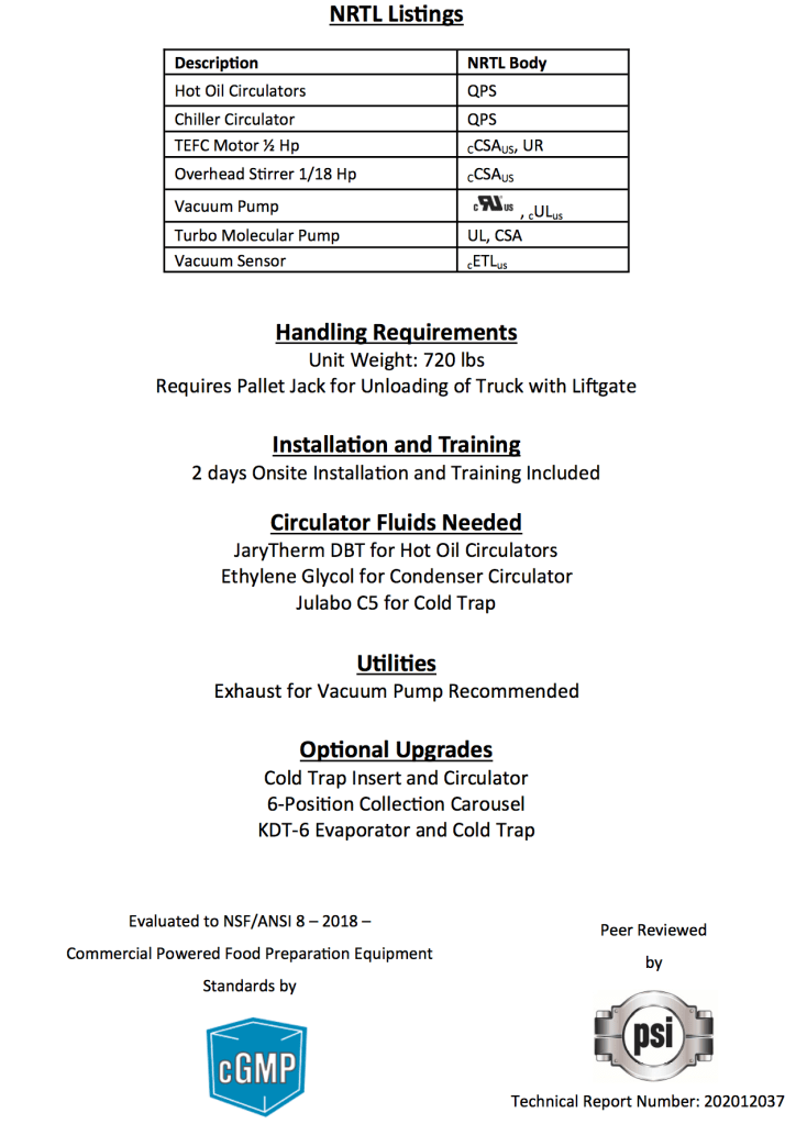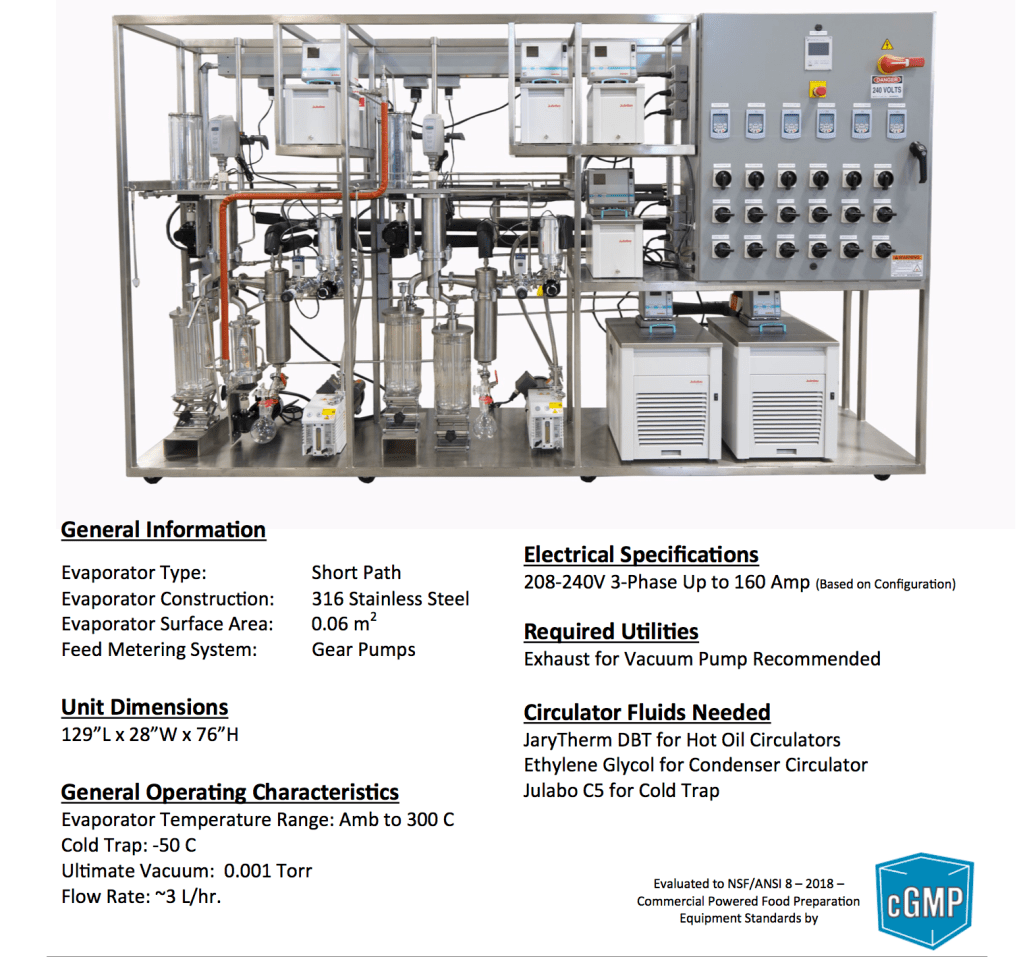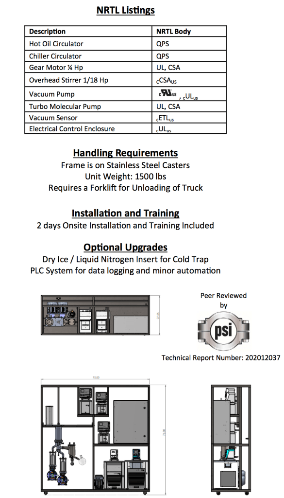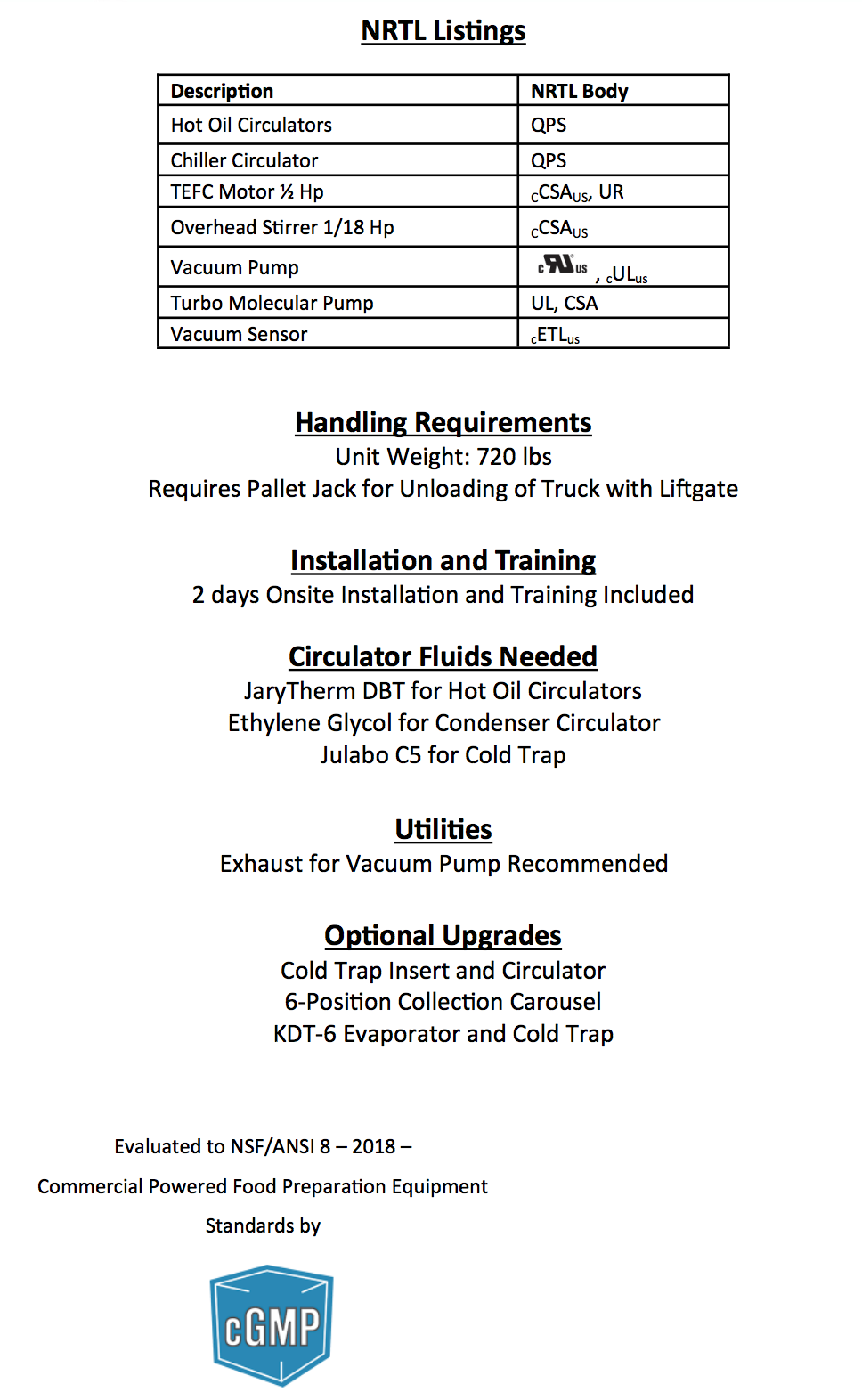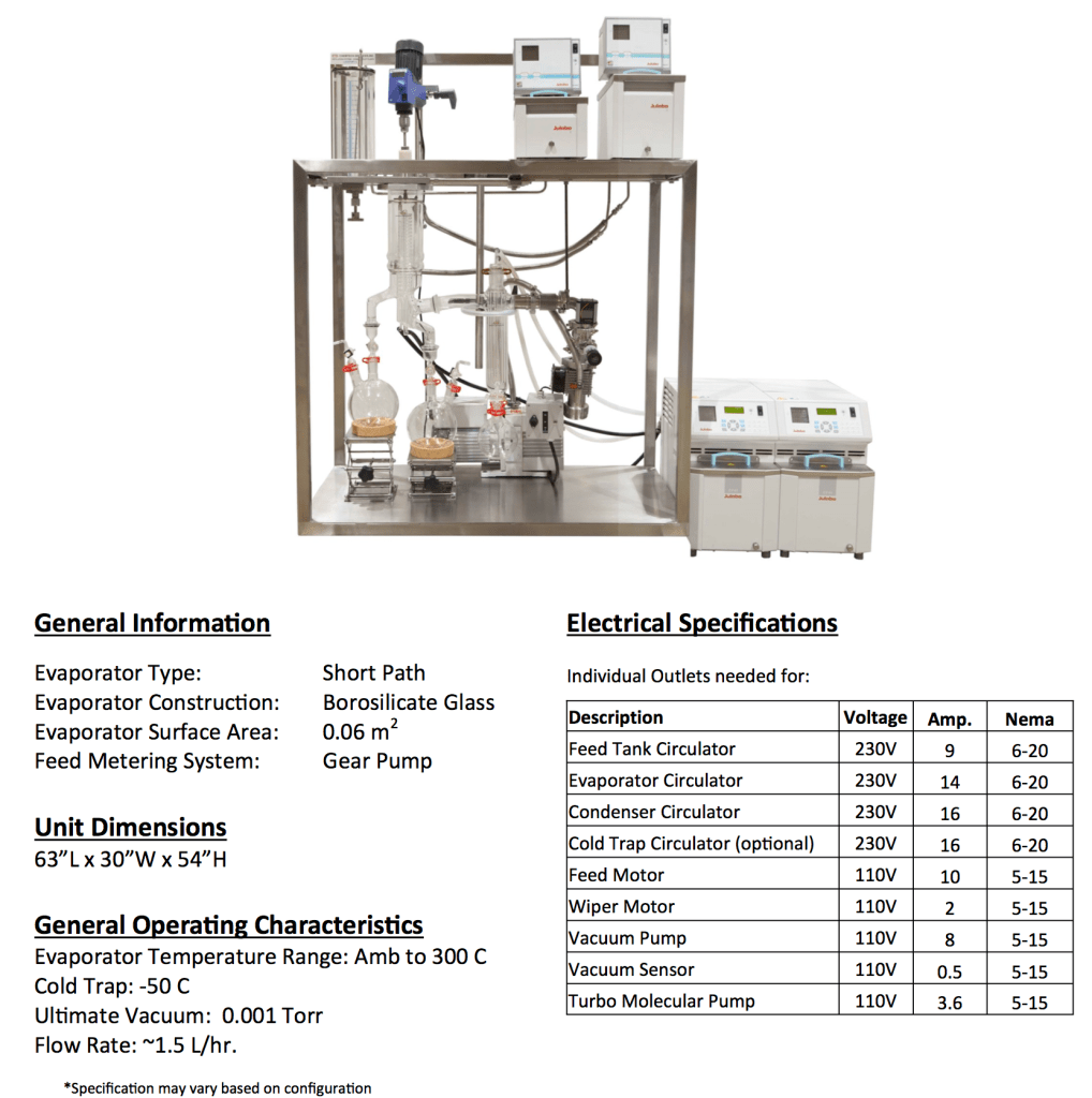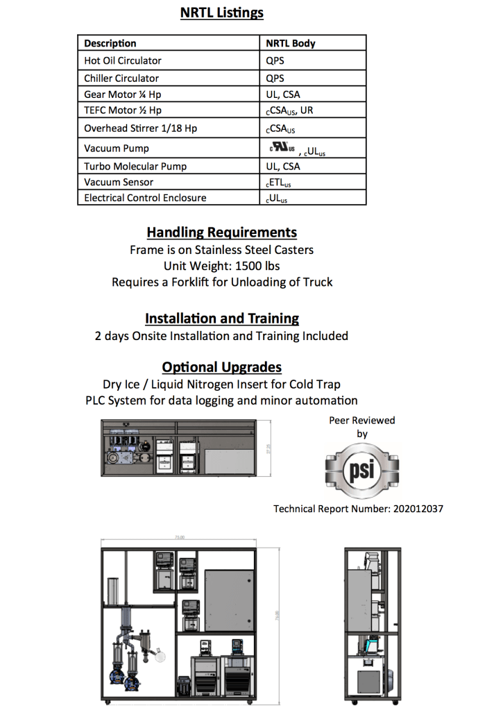 Processing rates are based on the system’s capacity to feed crude into the evaporator: average runtimes, yields, and final potency are dependent on input material, generally base on extracted biomass material anatomy, quality, and processing protocol.Check with your local Fire Marshall, Federal, and Industry Regulators for additional information.Shipping dimensions and weights may vary.All specification subject to change.Stock photo may not represent actual system as sold to date.Product performance, specification, and packages subject to change.Customized systems may have longer lead times. Equipment manufactured to be used only for legal purposes. Ask us about discounted Used and Refurbished systems sold “as is”.