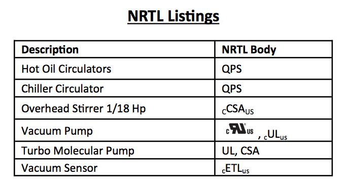 As suggested in the preceding sections, a functional distillation system includes many elements which require electrical power to operate. Summarizing, power will be required to operate: (a) Evaporator wiper system; (b) temperature control circulators: (c) vacuum pumps; (d) product feed or discharge pumps (if applicable); and (e) instrumentation (e.g., vacuum sensors, data loggers, PLC, etc.). Simple bench top systems can be assembled on a laboratory bench with a simple power strip providing electrical utility for all the components. However, in the case of frame mounted systems which typically utilize a multitude of electrical components it is more common practice to supply an electrical panel mounted on the frame for power and instrument signal distribution to the electrical components. The size of the electrical panel is typically influenced by the complexity of the distillation system (how many electrical components), control instrumentation requirements, and customer site prerequisites (e.g., NEC code and specific customer requests). Therefore, a laboratory distillation system which includes an electrical control panel may have an enclosure which ranges in size from a 12” by 12” panel to a full size 36” by 72” electrical & instrumentation enclosure.